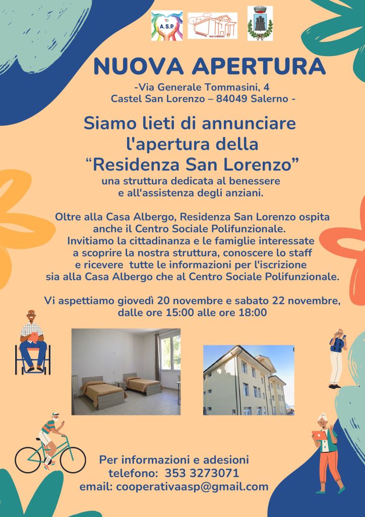 La Cooperativa sociale onlus A.S.P (accoglienza, solidarietà e partecipazione) con sede legale a Castel San Lorenzo costituita da un anno da giovani del posto, mira alla crescita, al bisogno sociale e allo sviluppo dei servizi del territorio con particolare sensibilità alla fasce più deboli e sensibili, quali bambini, anziani e persone diversamente abili..